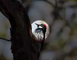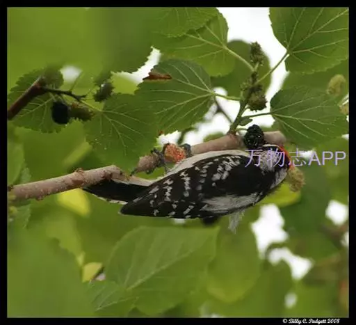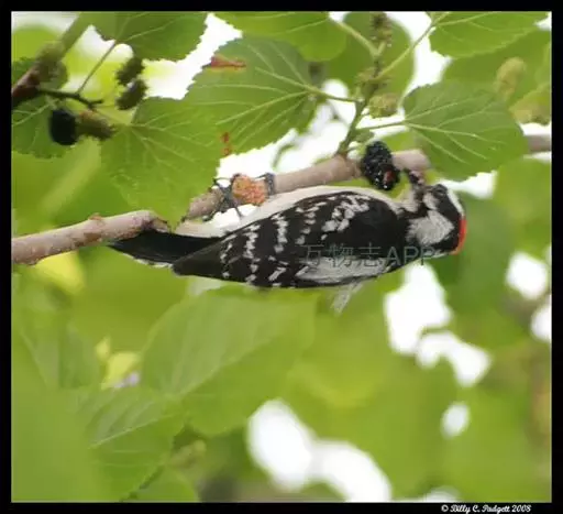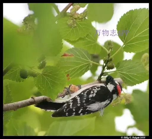 绒啄木鸟,北美洲最小的啄木鸟,白腹黑背和黑项,黑翼上有白色斑点。头部有黑白相间的条纹,尾巴短小,雄…