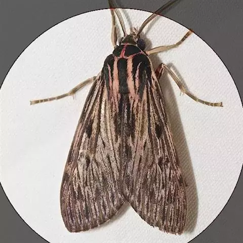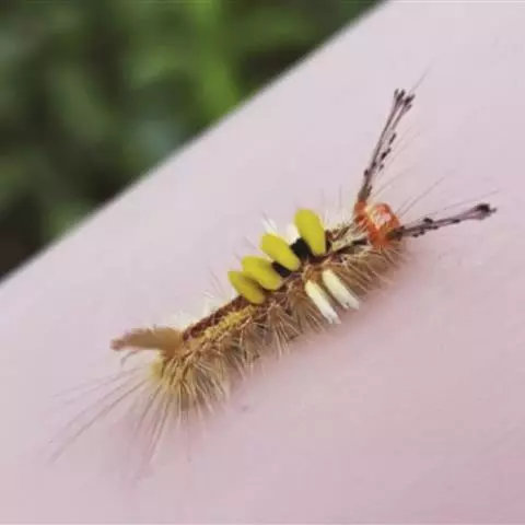 成虫雌雄异型. 雄成虫:体长约20毫米,前翅茶褐色,有4、5条波状横带,外缘呈深色带状,中室中央有一黑点。 雌虫:体长约25毫米,前翅灰白色,每两条脉纹间有一个黑褐色斑点。腹末有黄褐色毛丛。卵:圆形稍扁,直径1.3毫米,初产为杏黄色,数百粒至上千粒产在一起成卵块,其上覆盖有很厚的黄褐色绒毛。幼虫:老熟时体长50-70毫米,头黄褐色有八字形黑色纹。前胸至腹部第二节的毛瘤为蓝色,腹部第三-九节的7对毛瘤为红色。蛹:体长19~34mm,雌蛹大,雄蛹小。体色红褐或黑褐色,被有锈黄色毛丛。