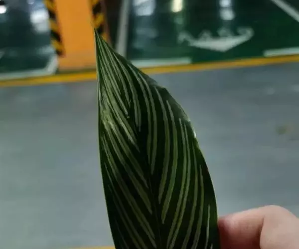 叶基生或茎生,叶片呈长椭圆形,长25-30厘米,宽8-15厘米。主脉两侧有白色带与暗绿色带交互成羽状排列,色彩对比鲜明。