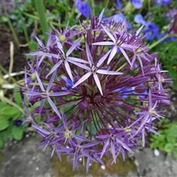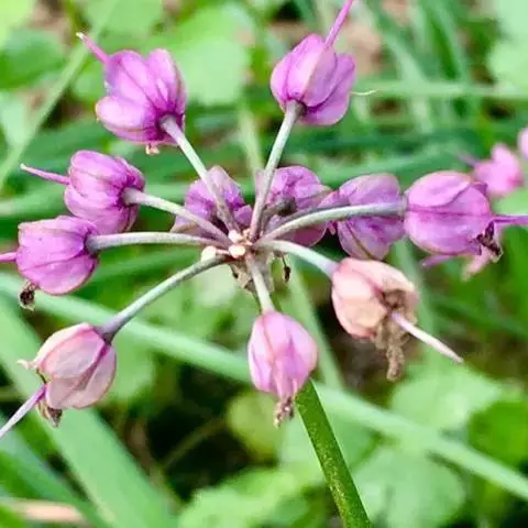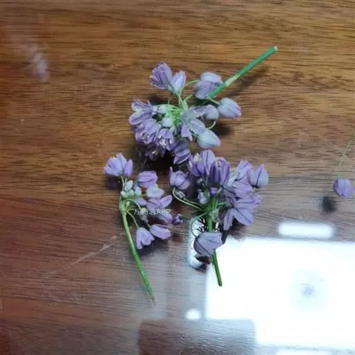 花葶侧生,圆柱状,高20-40厘米,下部被叶鞘;总苞2裂,比伞形花序短;伞形花序近半球状,较松散;小花梗近等长,比花被片长1-4倍,基部具小苞片;花淡紫色至暗紫色;花被片宽椭圆形至近圆形,顶端钝圆,长4-6毫米,宽3-4毫米,内轮的稍长;花丝等长,约为花被片长的1.5倍,仅基部合生并与花被片贴生,内轮的基部扩大,扩大部分每侧各具1齿,外轮的无齿,锥形;子房倒卵球状,腹缝线基部具有帘的凹陷蜜穴;花柱伸出花被外。花果期为10-11月。
