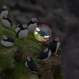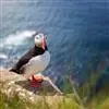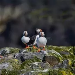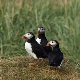 角嘴海雀夏季主要栖息于海岛、海岸和附近洋面上,常成小群活动,善游泳和潜水,主要以小鱼和甲壳类等动物为食。