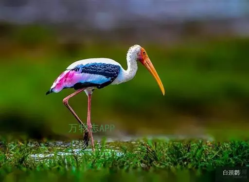 白头鹮鹳又叫彩鹳,羽色美丽,姿态优美。体长为93-102厘米,体重2-3.5千克,寿命最高可达28年以上。橙色的头部赤裸无羽,繁殖期变为红色。橙黄色的嘴粗而长,但嘴尖稍微向下弯曲,与白鹳、黑鹳等鹳属鸟类明显不同。通体白色。胸具宽阔的黑色横带。头的前半部裸出无羽,呈橙色。嘴橙黄色,长而粗,先端向下弯曲,脚亦特长,红色,胫的下部裸出。