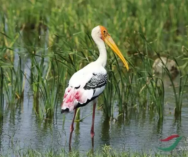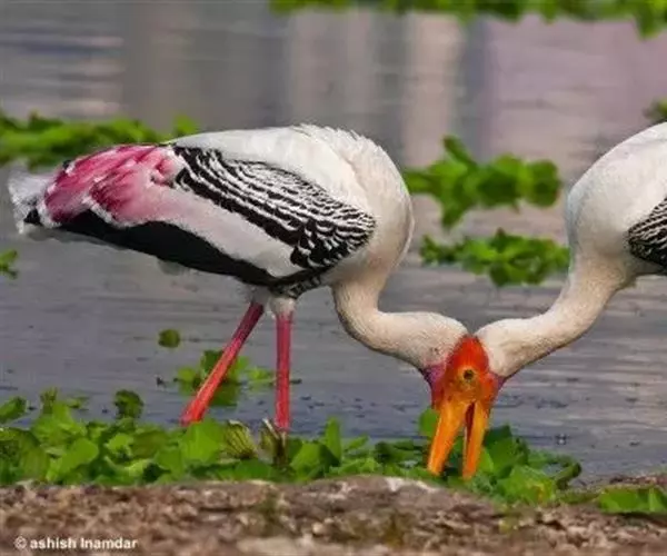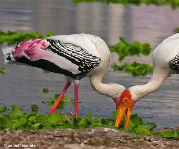白头鹮鹳(学名:Mycteria leucocephalus),又叫彩鹳,为鹳形目鹳科鹮鹳属的鸟类。羽色美丽,姿态优美,体长93-102厘米,体重2-3.5千克,寿命最高可达28年以上。橙黄色的嘴粗而长,但嘴尖稍微向下弯曲。脚为红色,也特别长,胫的下部裸出。橙色的头部赤裸无羽,繁殖期变为红色。体羽主要为黑色和白色,其中飞羽、尾羽为黑色,具有绿色的金属光泽,胸部具有宽阔的黑色胸带,也具有绿色的金属光泽,其余体羽均为白色。虹膜为淡黄色或褐色。