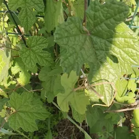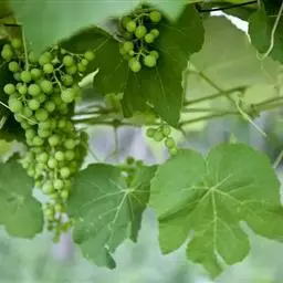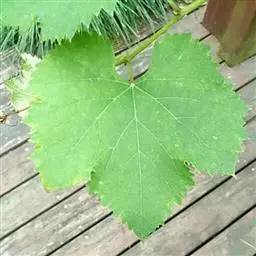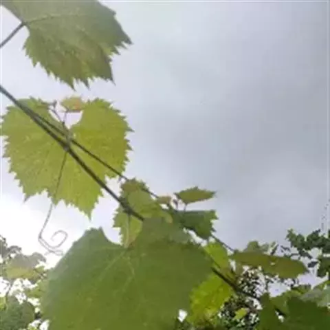青提葡萄幼嫩新梢上部有紫红色条纹,中下部为绿色;一年生枝浅褐色。梢尖3片幼叶微红色,叶背有稀疏绒毛;成龄叶五裂,上裂刻深,下裂刻浅,叶正背两面均无绒毛,叶片较薄,叶缘锯齿较纯,叶柄红色(或淡红色)。