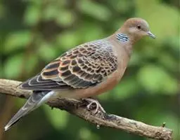 欧斑鸠体长27厘米,是一种体型略小的粉褐色斑鸠。颈侧具多黑白色细纹的斑块,翼覆羽深褐,…
