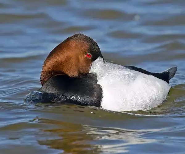 红头潜鸭雄鸟头和上颈栗红色,下颈和胸棕黑色,两肩、下背、翅上三级飞羽、内侧覆羽以及两胁均为淡灰色,缀以黑色波状斑纹。外侧覆羽灰褐色。初级飞羽也为灰褐色,外侧和羽端白色,且杂有黑色波状细斑。腰、尾上和尾下覆羽黑色,尾羽灰褐色。颏有一小白斑。上胸黑色,微具白色羽端,下胸及腹灰色。下腹有不规则的黑色细斑。尾下覆羽和腋羽白色。