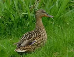 雌鸟头、颈棕褐色,上背暗黄褐色,下背、肩及内侧翅覆羽、三级飞羽灰褐色,具灰白色端斑和杂有细的黑色波状纹。翼镜灰色,腰和尾上覆羽深褐色。颏、喉棕白色。上胸暗黄褐色,下胸和腹灰褐色;下腹、两胁和尾下覆羽也为灰褐色,但杂有浅褐色横斑。