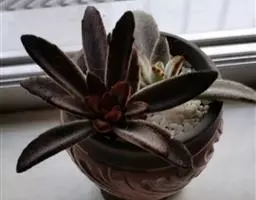 巧克力方砖为景天科拟石莲花属多肉植物,输中小型品种。植株肉质叶排成松散的莲座状。褐红色的叶片向内凹陷有明显的波折,叶缘有轻微米黄色边,强光下或者温差大,叶片会出现漂亮的紫褐色,如巧克力颜色。弱光则叶色浅褐绿,叶片拉长。植株叶面光滑,不容易积水。叶片无白粉,巧克力方砖需要接受充足日照叶色才会艳丽,株型才会相对紧凑美观,多年群生后,植株会非常壮观,特别是多年修剪过的老桩。巧克力方砖簇状花序,和大多数的石莲花一样的花型。