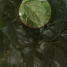 病害发生在新叶上,产生黄色小斑点后扩展成不规则的大斑,病斑边缘隆起,褐色边缘较宽。隆起的边缘外有延伸的黄色晕圈,中心黄褐色或灰褐色,上面密布黑色小点。