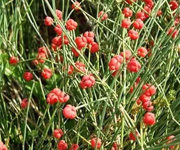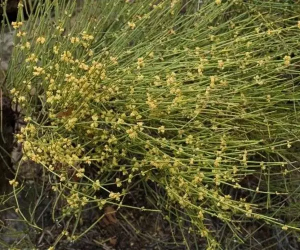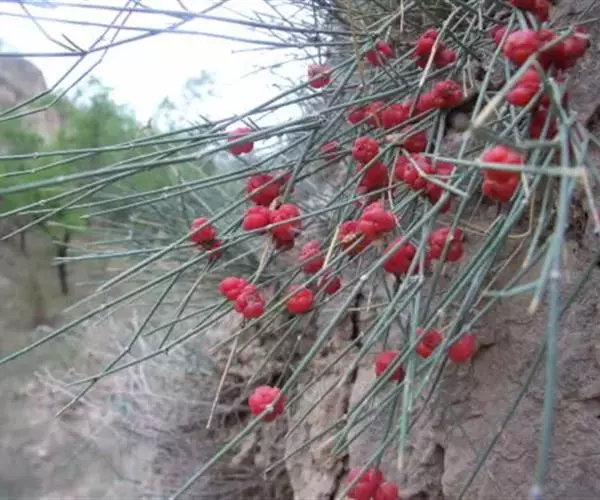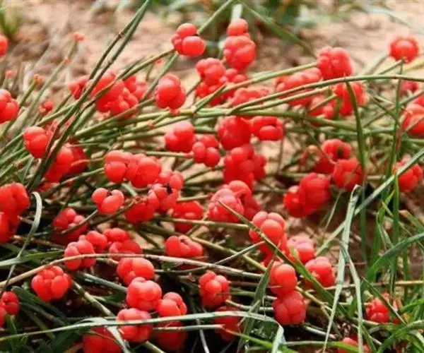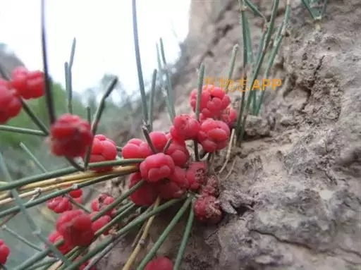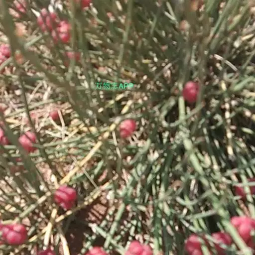 草本状灌木,高20-40厘米;木质茎短或成匍匐状,小枝直伸或微曲,表面细纵槽纹常不明显,节间长2.5-5.5厘米,多为3-4厘米,径约2毫米。叶2裂,鞘占全长1/3-2/3,裂片锐三角形,先端急尖。雄球花多成复穗状,常具总梗,苞片通常4对,雄蕊7-8,花丝合生,稀先端稍分离;雌球花单生,在幼枝上顶生,在老枝上腋生,常在成熟过程中基部有梗抽出,使雌球花呈侧枝顶生状,卵圆形或矩圆状卵圆形,苞片4对,下部3对合生部分占1/4-1/3,最上一对合生部分达1/2以上;雌花2,胚珠的珠被管长1毫米或稍长,直立或先端微弯,管口隙裂窄长,约占全长的1/4-1/2,裂口边缘不整齐,常被少数毛茸。雌球花成熟时肉质红色,矩圆状卵圆形或近于圆球形,长约8毫米,径6-7毫米;种子通常2粒,包于苞片内,不露出或与苞片等长,黑红色或、灰褐色,三角状卵圆形或宽卵圆形,长5-6毫米,径2.5-3.5毫米,表面具细皱纹,种脐明显,半圆形。花期5-6月,种子8-9月成熟。