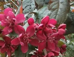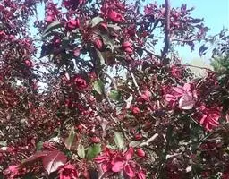 红宝石海棠(学名:Malus micromalus cv. “Ruby”):从美国引种,是集叶、花、果、枝、树形同观共赏的绿化、彩化树种。该树种以其优美的树形、丰富多彩的观赏效果成为中国珍贵的城市绿化彩色树种。具有“叶红、花红、果红、枝亦红”的特点,花、果、枝干、叶在生长期中均表现出红宝石颜色。春季红色的枝条发芽后,其嫩芽嫩叶血红,红宝石海棠整个生长季节叶片呈紫红色,整株色感极好,蜡质光亮。开出花朵粉红色,花期4-5月。坐果后鲜红的果实挂满全树,果为红色梨果,接近于球形,果实成熟期为8-9月份。秋天满树红叶,满枝红果,满树紫枝,果实累累。冬季,鲜红的枝条。