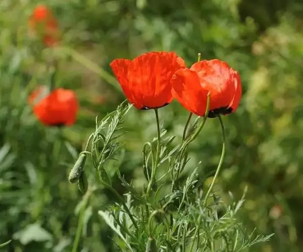 一年生草本,高20-40厘米。主根圆柱形,垂直,长达8厘米,少分枝。茎直立,圆柱形,具分枝,疏被灰黄色刚毛。基生叶多数,叶片轮廓卵形,长3-8厘米,二回羽状深裂,小裂片线形或线状长圆形,绿色,背面疏被刚毛,叶脉两面均明显;叶柄长3-8厘米,被灰黄色刚毛,基部扩大成鞘;茎生叶同基生叶,但较小和具短柄至近无柄。花单个顶生和腋生,具花梗,花梗长达14厘米,被紧贴、灰黄色刚毛;花芽卵圆形,长1.5-2厘米;尊片卵形,盔状,疏生刚毛;花瓣卵形至近圆形,长2-3厘米,鲜红色,基部约7毫米为暗紫色;雄蕊多数,花丝线形,长约1厘米,花药长圆形,长约1毫米;子房圆柱形,长1-1.8厘米,无毛,花柱短,柱头4裂片,下延。蒴果狭圆柱形,向上渐狭,长4-5厘米,无毛,柱头每2个裂片间具1个刚毛状附属物,附属物内弯并超出柱头,成熟时4瓣自顶端向基部开裂。种子多数,肾形,表面蜂窝状。花果期4-6月。