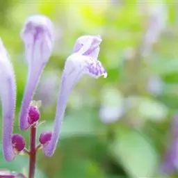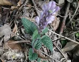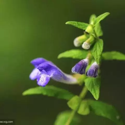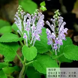 紫背黄芩,别名异色黄芩。为多年生草本;根茎匍匐,节上密生纤维状须根。茎上升或直立,连花序高5.5~38厘米,粗0.8~2毫米,四棱形,具槽,密被微柔毛,通常带红色,不分枝或间有花序分叉,近基部具叶且多少木质化,上部无叶。茎叶通常2~4对,罕有6~7对,密集于茎基部如基生叶状,或彼此远离,相隔1.6~3.5厘米,叶片坚纸质,椭圆形,卵圆形或宽椭圆形,长1.5~7.4厘米,宽1~4.8厘米,先端浑圆或钝,基部心形或浅心形,边缘具波状圆齿,上面绿色,密被极细的微柔毛间杂有短柔毛,下面绿色或常带紫色,有时灰绿色,被短柔毛,尤以脉上者为甚,侧脉4~5对,与中脉均上面略凹陷下面突出,在叶缘的内方网结,叶柄长0.5~2.2厘米,有时达4.8厘米,扁平,密被短柔毛;苞叶细小,草质,卵圆形至椭圆形,长0.7~2.5厘米,宽0.5~1.5厘米,先端钝,基部圆状截形,无柄或具短柄。花互生或少数在花序下部者对生,组成背腹向的总状花序或因花序分叉而多少呈圆锥状,花序长5~24厘米,花葶状;苞片小,狭卵圆形或卵圆形,长1.5~3毫米,宽约1毫米,全缘,被短柔毛;总梗长2.5~4厘米,与序轴均密被微柔毛;花梗长2.5~3毫米,通常带紫色,密被短柔毛。花萼长约2毫米,外被短柔毛及具腺短柔毛,内面无毛,盾片开张,半圆形,高0.5~0.8毫米,被短柔毛,果时增大,盾片高起且外卷,与萼几等长。花冠紫色,长0.9~1.2厘米;冠筒长0.7~1厘米,外面疏被短柔毛及具腺短柔毛,内面前方基部被微柔毛或短柔毛余部无毛,基部成膝曲状,由下向上渐渐增大,至喉部径达3毫米;冠檐二唇形,长约3毫米,外面疏被短柔毛及具腺短柔毛,内面被微柔毛或短柔毛,上唇盔状,先端微凹,下唇中裂片卵状圆形,两侧裂片卵圆形或长圆状卵圆形。雄蕊4,二强;花丝细长,扁平,中部以下被纤毛。花盘肥厚,倾斜,边缘具淡黄色泡状突起;子房柄不明显。花柱细长,无毛。子房具瘤。小坚果成熟时褐色或棕褐色,卵状椭圆形,长约1毫米,径不达1毫米,具瘤,腹面中央隆起,其上有一小果脐。花期6~11月,果实渐次成熟。