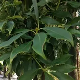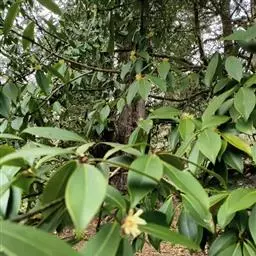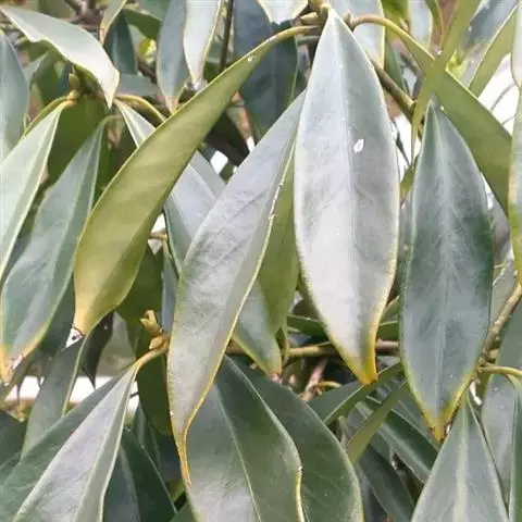 叶单生,互生,长椭圆形或倒卵状椭圆形,长 8~15 公分,宽 3~5 公分,先端渐尖,基部渐狭,革质,全缘但略反卷,侧脉不明显,表面有光泽无毛茸;叶柄长 0.6~1 公分。