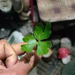 叶基生叶和茎生叶均有长柄,叶片近圆形,长及宽为2—5厘米,基部近截形,3深裂或5浅裂,中裂片前缘有粗锯齿,侧裂片边缘多锯齿或浅裂,叶柄长3—6厘米,基部有宽膜质鞘;茎上部叶较小,叶柄较短。