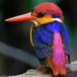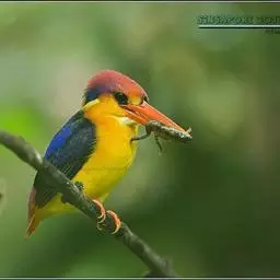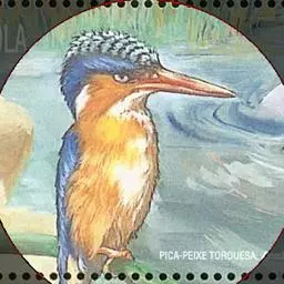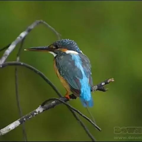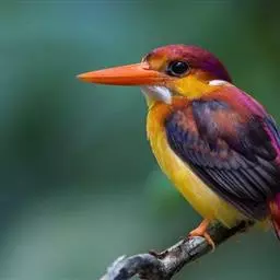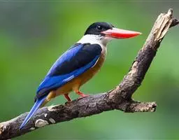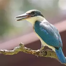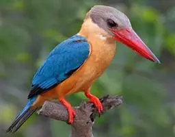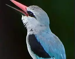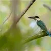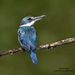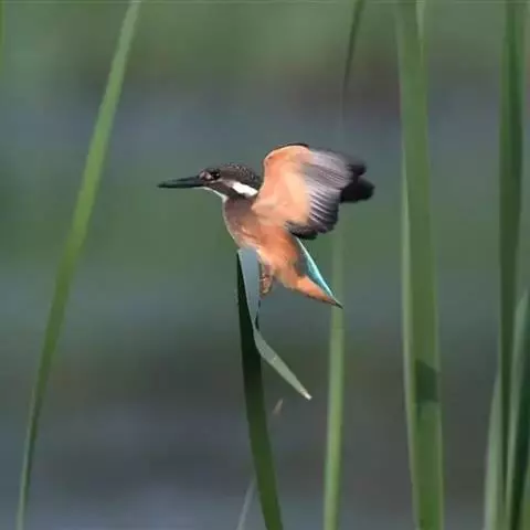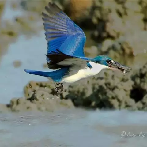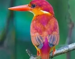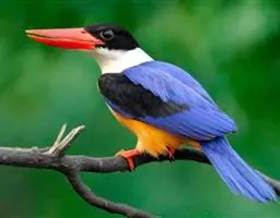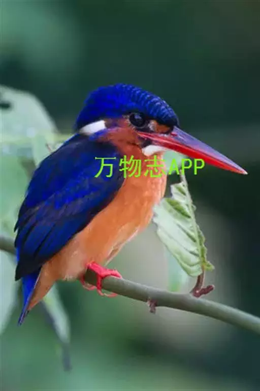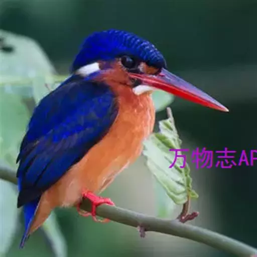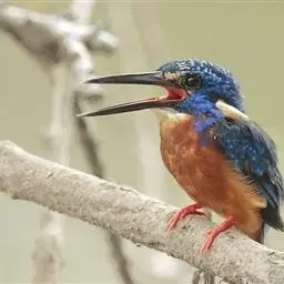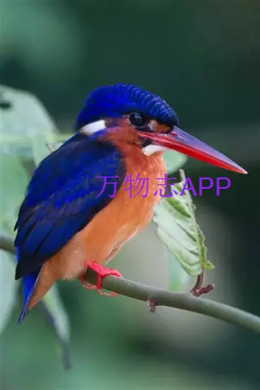 蓝翠鸟(学名:Ceyx azureus):体长17-19厘米,翼展25-29厘米,体重40克。体羽艳丽而具光辉,头、背羽蓝色有光泽,胸腹部是美丽明亮的桔红色或红棕色,翅膀上夹有一些黑色,后颈和喉部有白斑,尾下尖部是斑驳的灰黑色,腿和脚是鲜红色。嘴粗直,长而坚。食物以小鱼为主,兼吃甲壳类和多种水生昆虫及其幼虫,也啄食小型蛙类和少量水生植物。
