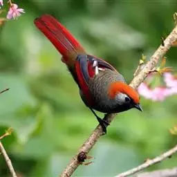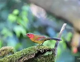 赤尾噪鹛中型鸟类,体长24~28厘米。头顶至后颈红棕色,两翅和尾鲜红色,眼先、眉纹、颊、颏和喉黑色,…