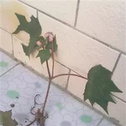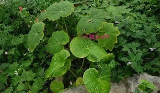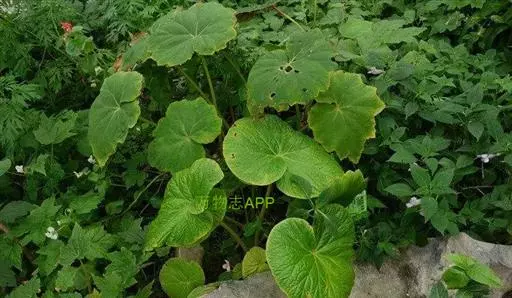 基生叶1,和茎生叶同形,均具长柄。叶片两侧不相等,轮廓卵状长圆形,长12-14厘米,宽11-13厘米,先端尾状渐尖,基部深心形,窄侧圆形,宽侧向下延伸达2-4厘米,呈圆耳状,边缘有不等短三角形之齿,齿尖常带芒,并常有浅裂,裂片宽三角形,先端急尖,上面深绿色或褐绿色,近无毛或散生极短硬毛,下面淡绿色,近无毛,掌状6条脉,窄侧2条,宽侧4条,侧脉明显;叶柄长17-27厘米,有棱,近无毛;托叶早落。花葶高13-20厘米,有棱,无毛。