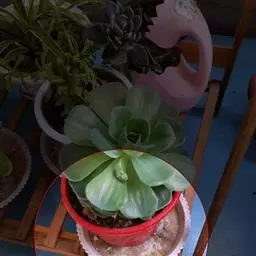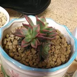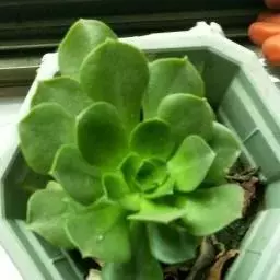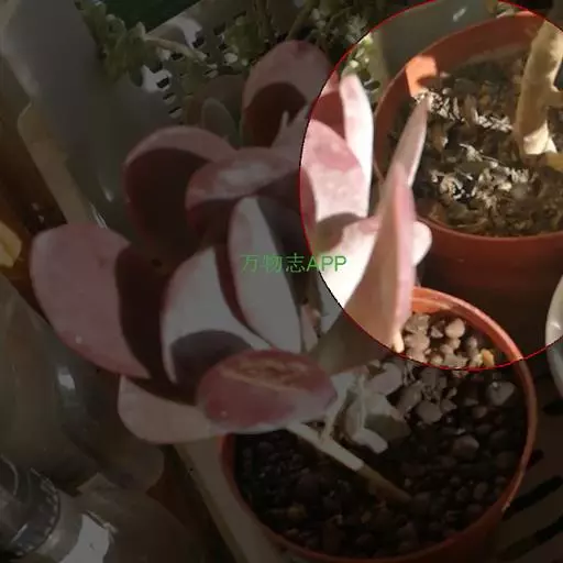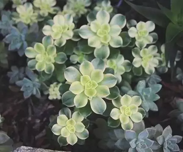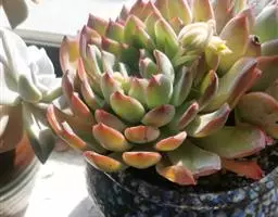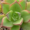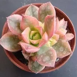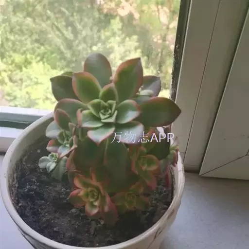 夕映 叶多肉,成基生叶丛,呈莲座状,叶片为扁平卵形,新生叶片总体为淡黄色,中心淡绿色,老叶黄色减少。夏季几乎完全为深绿色,秋冬季节绿色减淡,锦斑会变得较为模糊,充足光线下边缘会呈现橘红色至桃红色,成株直径约10-15厘米。极易产生分株,摘下分株晾干数日后扦插,即可成为新株。