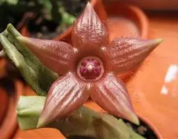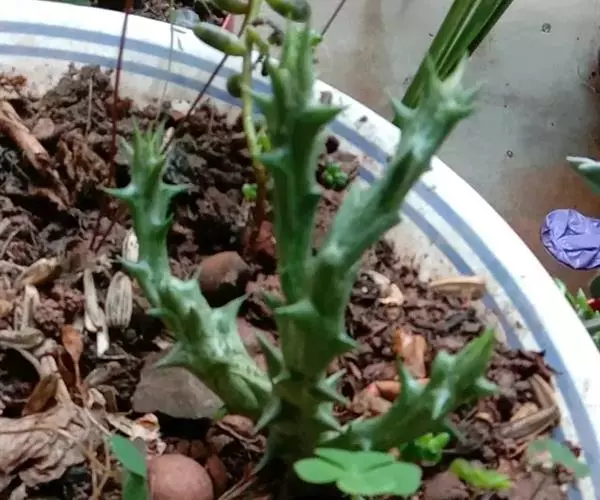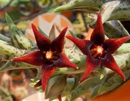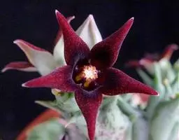 茎4棱,长20—40厘米,表皮橄榄绿或灰绿色,顶端有细小而早落的叶。花褐色,大1.3厘米,簇生于茎侧四面。水牛掌属植物通常表皮颜色暗淡并常有暗花纹,本种表皮色彩较明快并没有花纹,茎较细反,和常见水牛角属种类不同。适宜植物园及部分爱好者栽培。