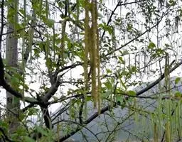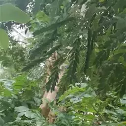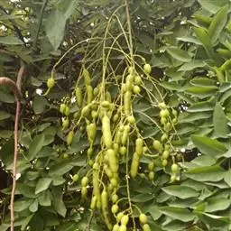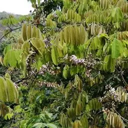 种子采摘:采种树选择10年生以生长茂盛无病虫害的大树作为采种树,每年9-10月份,在果实成熟时呈深褐色,且果荚开裂时采摘。用布袋装回果实后,扒开果荚取出种子,置室内通风晾干,忌曝晒,常温条件下干藏至次年春夏季。种子装袋干藏,发芽能力可保持1-2年,种子千粒重1kg。