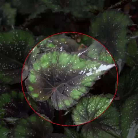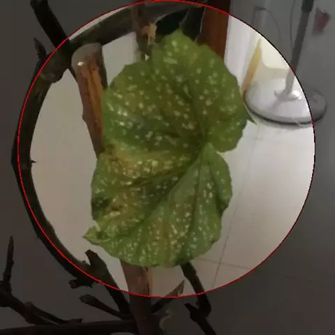 由漆斑菌引起的秋海棠叶斑病症状:病症一般出现在秋海棠叶片边缘、叶尖和破损叶片的叶脉上。坏死区域呈现黑褐色,然后是水渍状。诊断方法是下部的叶片经常会不规则形状的孢子群,中央呈黑色,但边缘为白色。