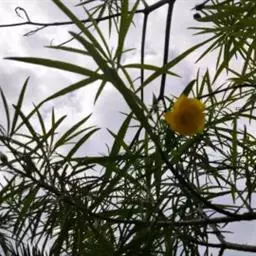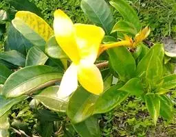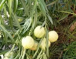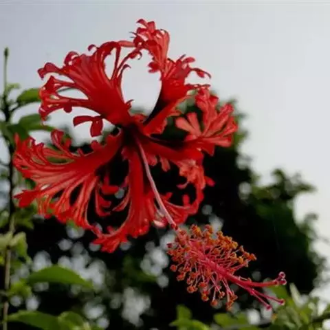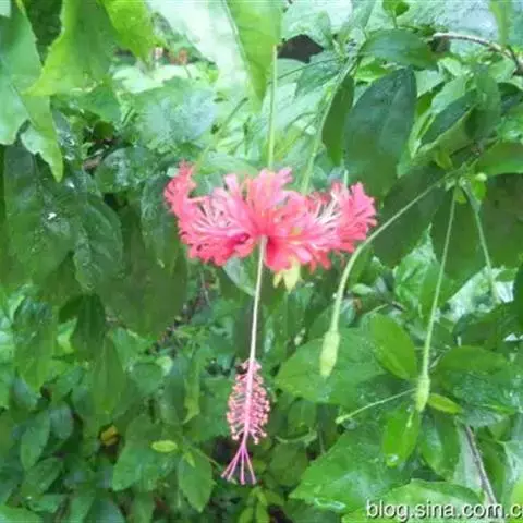 花朵自叶腋2厘米处生出,花较细长,壶状,颜色鲜艳,红褐色,长约2.5厘米。花托隆起,呈紫色。花后结出羊角状的果实。该种花期为春季、夏末至早秋,每朵花可持续开放约6周。 [7-9]