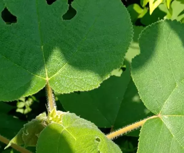 叶螺旋状排列,广卵形至长椭圆状卵形,长6-18cm,宽5-9cm,先端渐尖,基部心形,两侧常不相等,边缘具粗锯齿,不分裂或3-5裂,小树之叶常有明显分裂,表面粗糙,疏生糙毛,背面密被绒毛,基生叶脉三出,侧脉6-7对;叶柄长2.5-8cm,密被糙毛;托叶大,卵形,狭渐尖,长1.5-2cm,宽0.8-1cm。