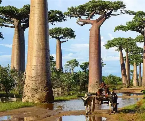 马达加斯加岛观赏猴面包树最著名的景点是位于 坦桑尼亚生长的猴面包树与大象的体型对比 岛西部距离首都700多公里左右的穆隆达瓦地区,驱车先南下途经安齐拉贝再拐向西到芒里瓦褚镇,从该镇开始路况变得颠簸崎岖,雨季期间(每年的12月到3月上旬),一般只有四驱越野车方能通行,交通巴士也有,但是剩下不到300公里的路还需要行车约10个小时,路况可见一斑了。