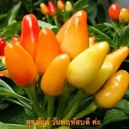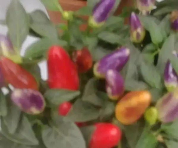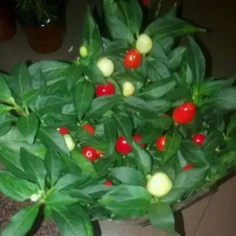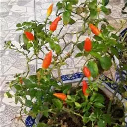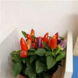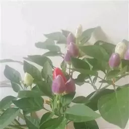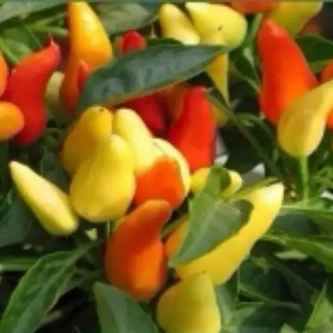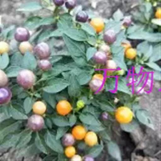五色椒又名朝天椒,五彩辣椒,为辣椒 变种,味涩。属茄科多年生半木质性植物,常作一年生栽培;江苏沭阳一带有不少花农种植,其株高30厘米—60厘米,分枝多、茎直立,单叶互生;花白色,开花期5月初—7月底,果实簇生于枝端。同一株果实有红、黄、紫、白等颜色,有色泽,盆栽观赏很逗人喜爱,也可食用,风味同青椒。 辣椒果色鲜艳,点缀在绿叶中,灵巧可爱。可以单株培植于小盆中或数株合植于稍大的盆中,陈设于客厅、卧室或厨房,装饰效果非常好。全草入药,根茎性温、味甘,能祛风散寒,舒筋活络并有杀虫、止痒功效。植株对空气中的二氧化硫和三氧化硫等有毒气体有一定的吸收和抵抗能力。