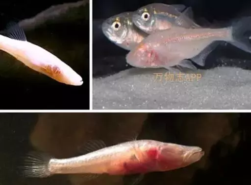 盲鱼,最大的体长不到10厘米,它们的外表长得十分奇特:细长的身体粉红而透明,可以清楚地看到它体内的脊椎和内脏,形如一条条玻璃鱼。