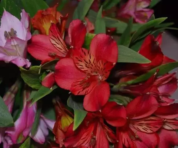 六出花(Alstroemeria aurantiaca D.Don)也叫智利百合、秘鲁百合等,是石蒜科、六出花属多年生草本,原产智利,高60~120厘米。花朵像杜鹃又像水仙,茎和叶子则像是百合花。叶多数,叶片披针形,有短柄或无柄。伞形花序,花10~30朵,花被片橙黄色、水红色等,内轮有紫色或红色条纹及斑点。花期6~8月。