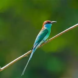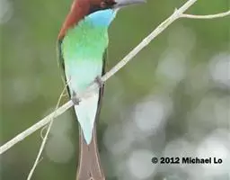 蓝喉蜂虎中型鸟类,体长26~28厘米。头顶至上背栗红色或巧克力色,过眼线黑色,腰和尾蓝色,翼蓝绿色,…