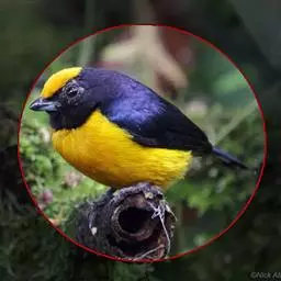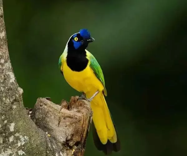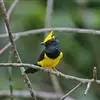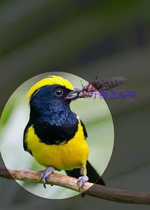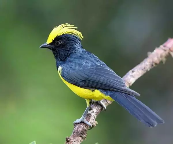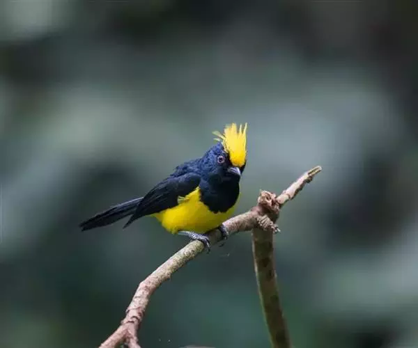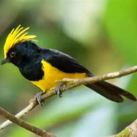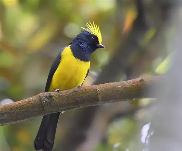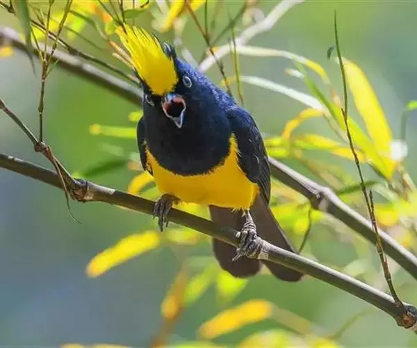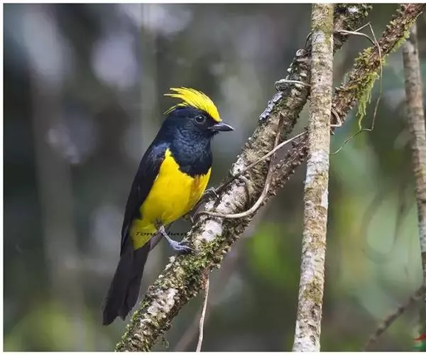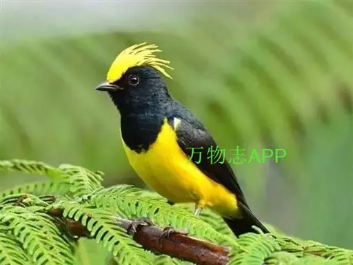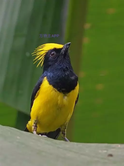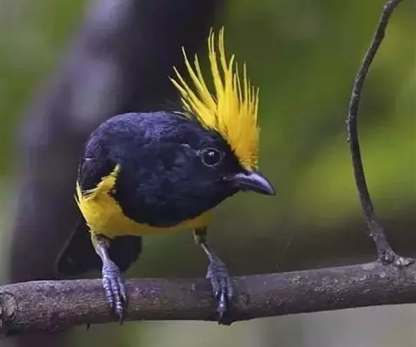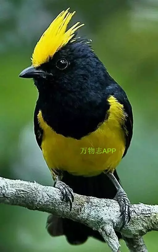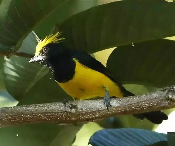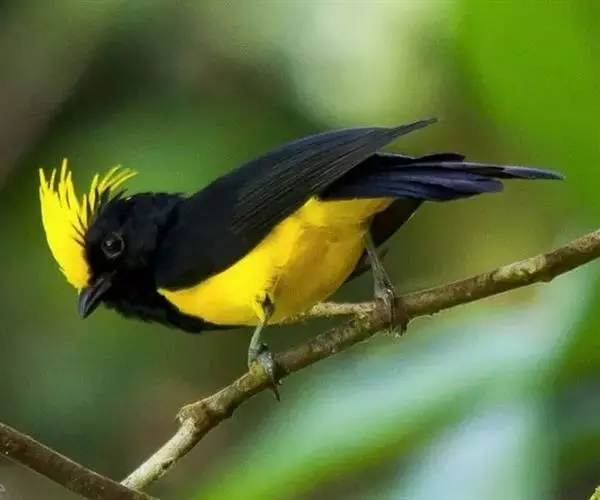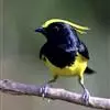 雌鸟额、头顶和羽冠亦为黄色,但羽色较暗淡而少光泽;头侧、枕后颈、颈侧、背、肩和尾上覆羽橄榄绿色。颏、喉、胸暗黄橄榄色,下余下体黄色,两翅和尾黑色微沾绿色。幼鸟和雌鸟相似,但羽冠不及成鸟长而显著。