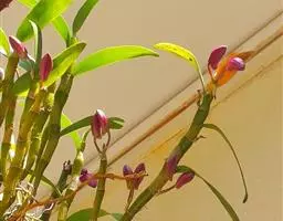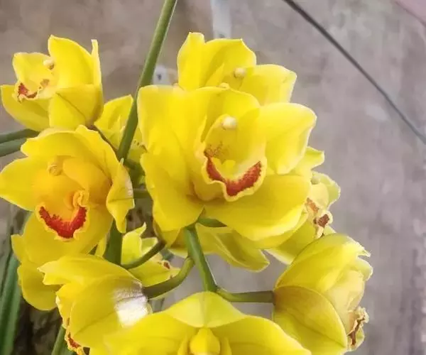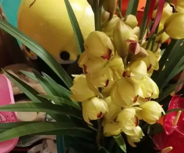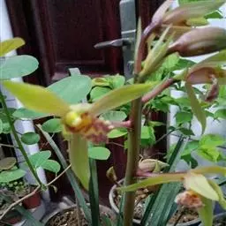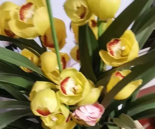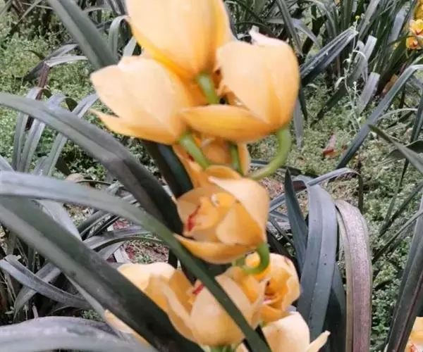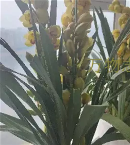 (6)大花蕙兰的花:开花期养分不足或高温或温差大于10℃易造成落花落蕾。深色花喜强光,弱光下容易出现垂叶现象。
