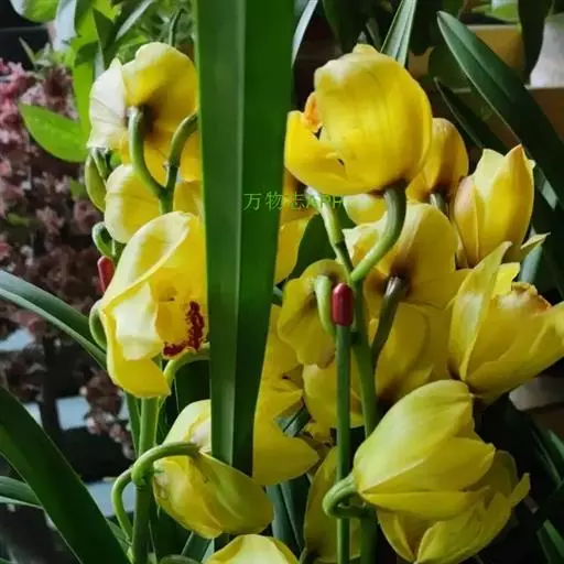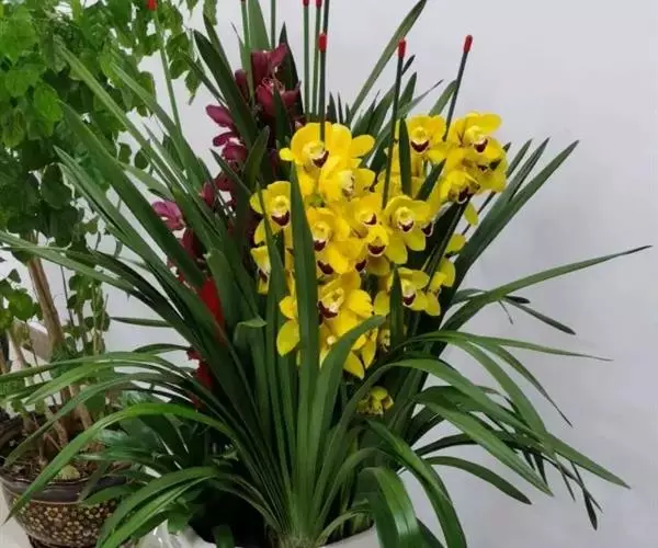 3.大花蕙兰花期养护:开花期最适温8℃至15℃,不能放于高温干燥的暖气旁边,花期3天浇水一次,长时间2℃至3℃的低温花则发生冻害,花苞变黄,不能开放,观赏期50至80天。