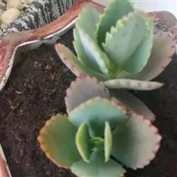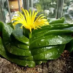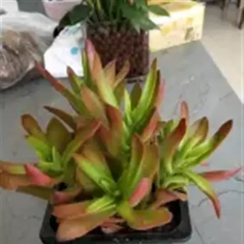 叶子表面宽厚,富肉质感且带有磨纱质感,看像石头质地;开红色小花,生于植株顶部,倒伞形密生,形状像花…