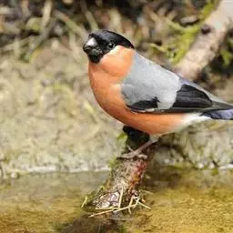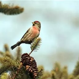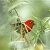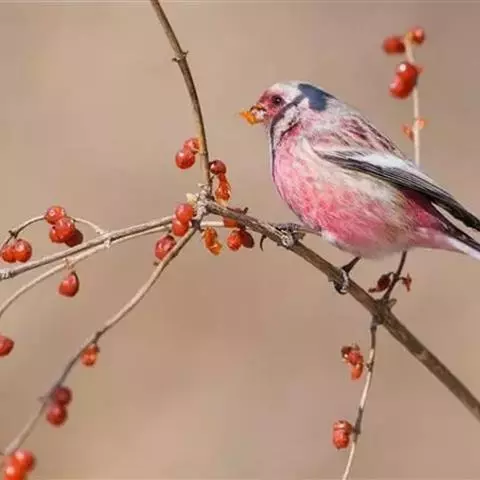 红腰朱雀:体长12-14厘米,小型鸟类。雄鸟前额和眉纹玫瑰粉红色,头顶和一宽的贯眼带深红褐色,背红…