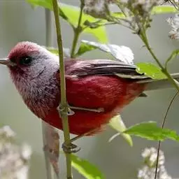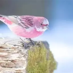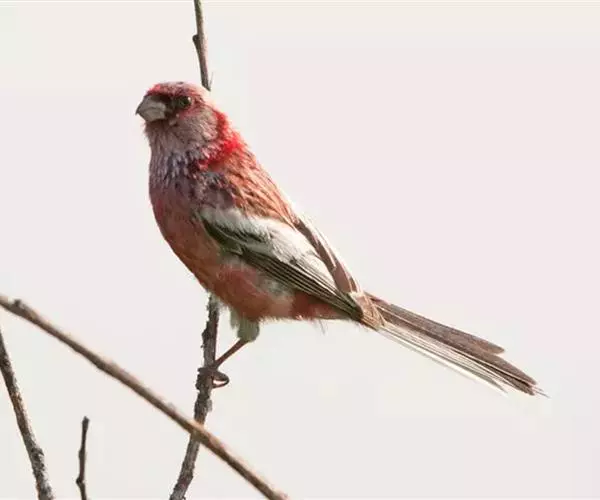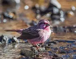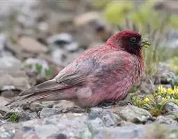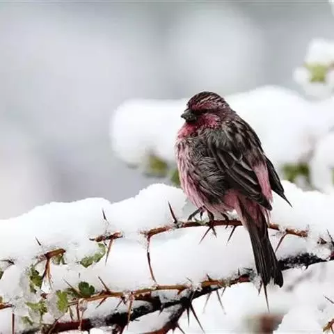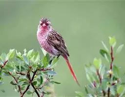 藏朱雀:全长约17-18厘米。雄鸟头部深红色具光辉,喉部暗红色具白色点斑;背部灰白色,各羽具玫瑰红…