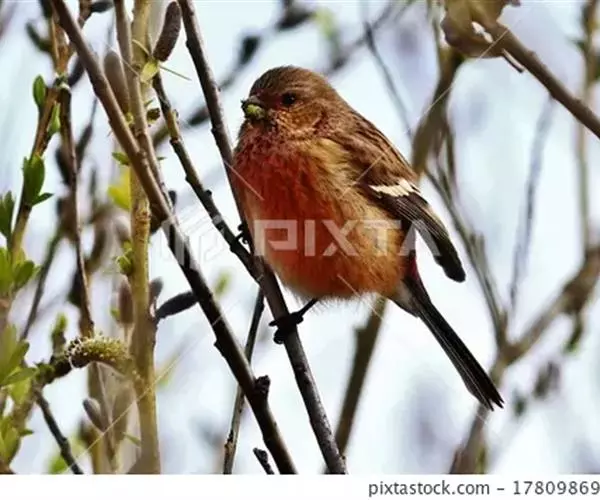 红眉朱雀:体长15厘米,是一种中等体型的朱雀。上体褐色斑驳,眉纹、脸颊、胸及腰淡紫粉,臀近白。…