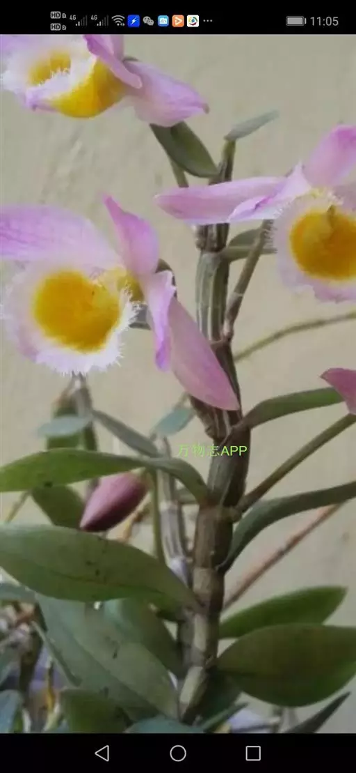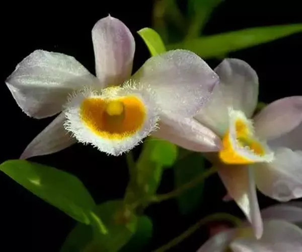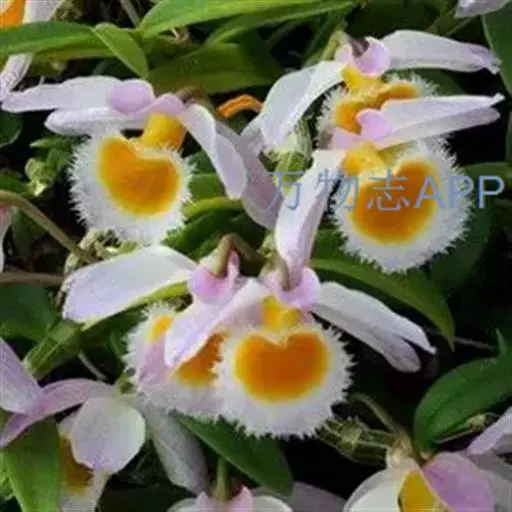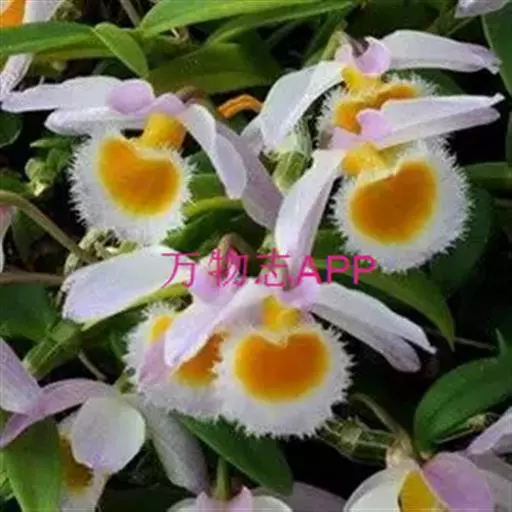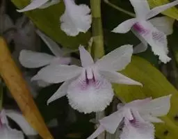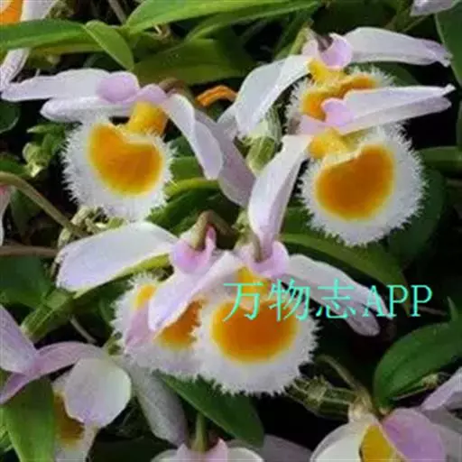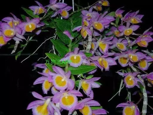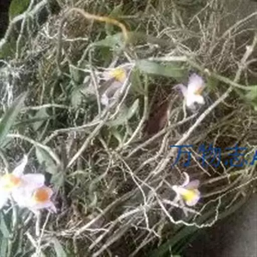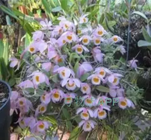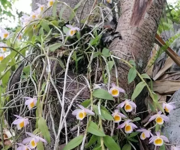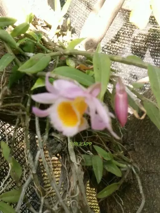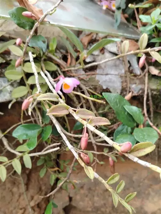 美花石斛(学名:Dendrobium loddigesii Rolfe):茎柔弱,常下垂,细圆柱形,有时分枝,具多节;节间长1.5-2厘米,干后金黄色。叶纸质,二列,互生于整个茎上,舌形,长圆状披针形或稍斜长圆形。花白色或紫红色,每束1-2朵侧生于具叶的老茎上部;花瓣椭圆形,与中萼片等长,宽8-9毫米,先端稍钝,全缘,具3-5条脉;唇瓣近圆形,直径1.7-2厘米,上面中央金黄色,周边淡紫红色,稍凹的,边缘具短流苏,两面密布短柔毛。花期4-5月。
