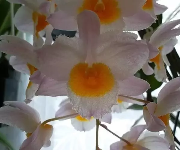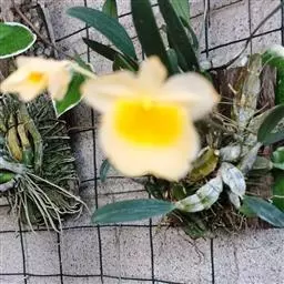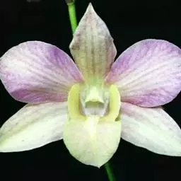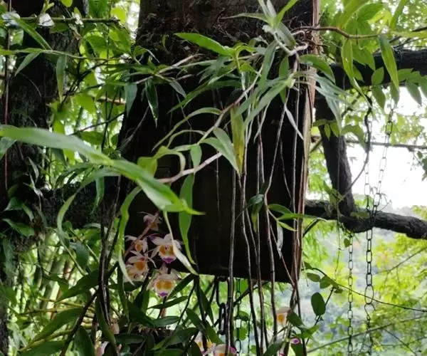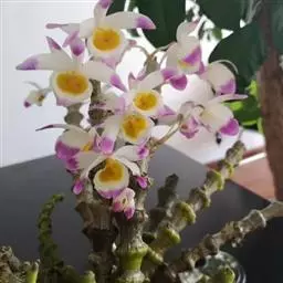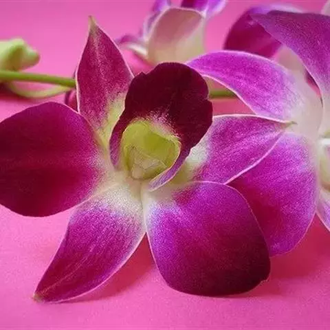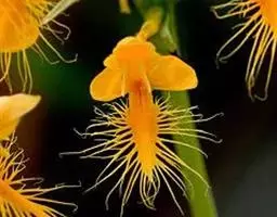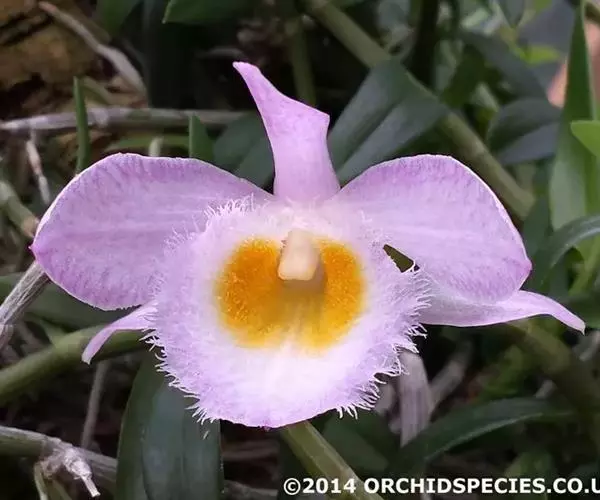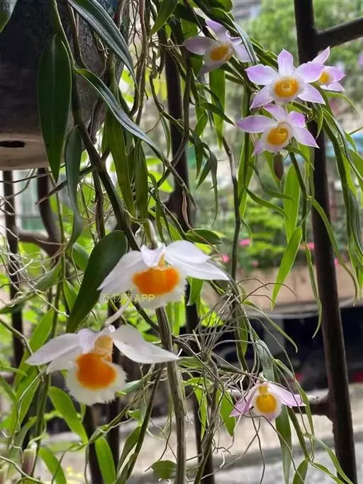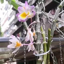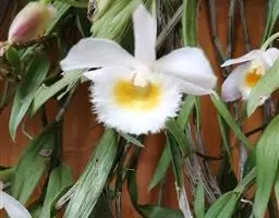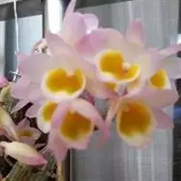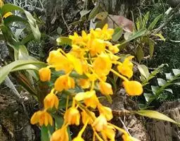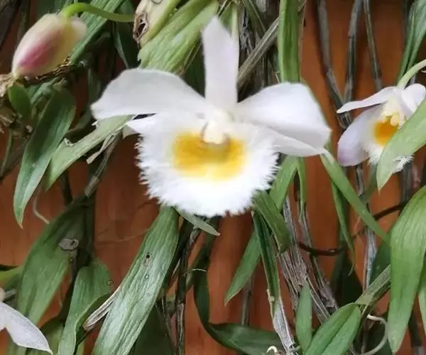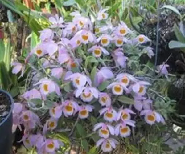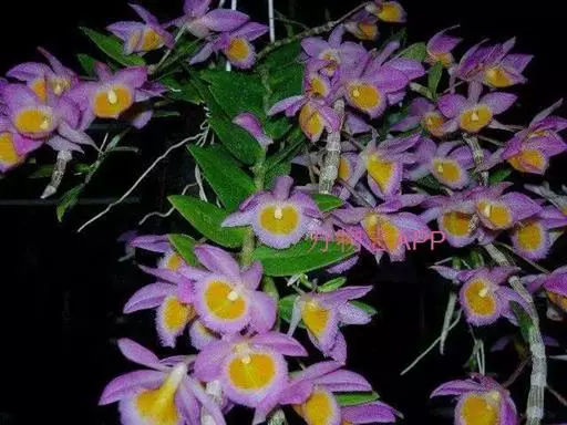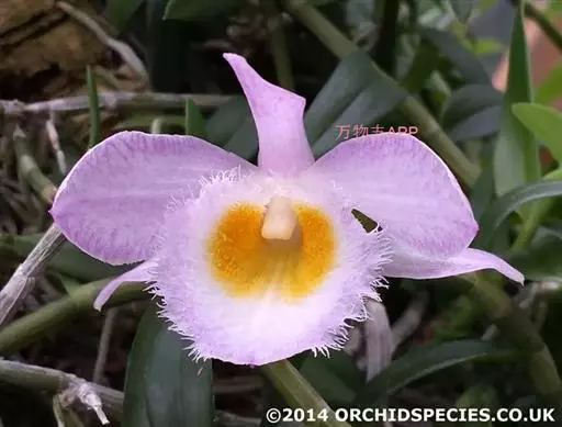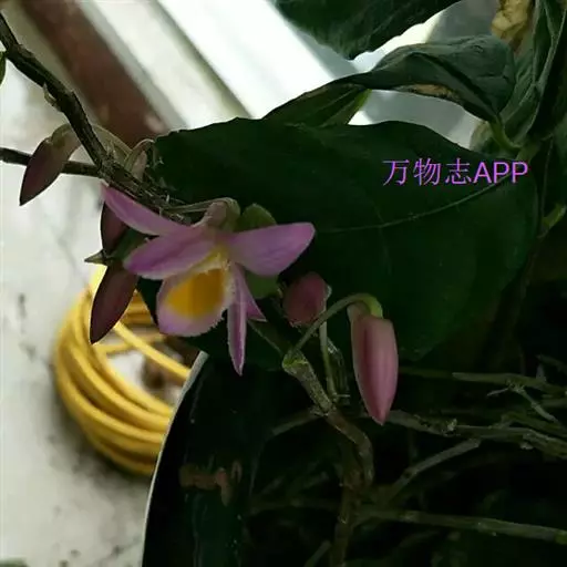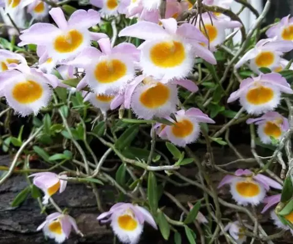 美花石斛(学名:Dendrobium loddigesii Rolfe):茎柔弱,常下垂,细圆柱形,有时分枝,具多节;节间长1.5-2厘米,干后金黄色。叶纸质,二列,互生于整个茎上,舌形,长圆状披针形或稍斜长圆形。花白色或紫红色,每束1-2朵侧生于具叶的老茎上部;花瓣椭圆形,与中萼片等长,宽8-9毫米,先端稍钝,全缘,具3-5条脉;唇瓣近圆形,直径1.7-2厘米,上面中央金黄色,周边淡紫红色,稍凹的,边缘具短流苏,两面密布短柔毛。花期4-5月。