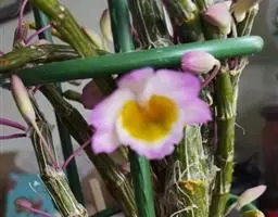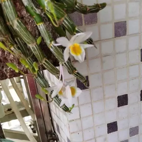 束花石斛是兰科石斛属植物。茎粗厚,肉质,下垂或弯垂,圆柱形,不分枝,具多节。叶二列,互生于整个茎上,…