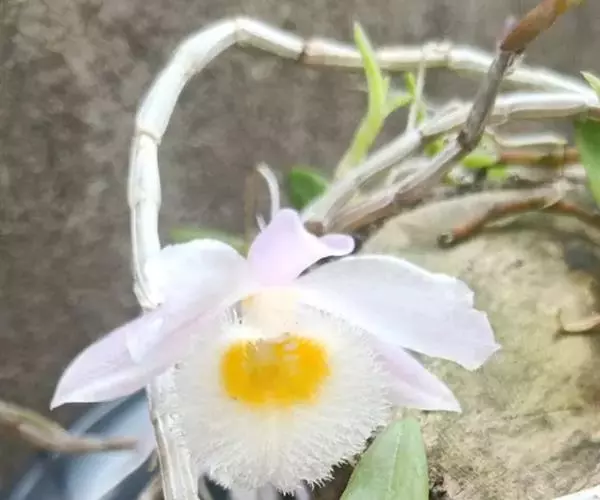 美花石斛茎柔弱,常下垂,细圆柱形,长10-45厘米,粗约3毫米,有时分枝,具多节;节间长1.5-2厘米,干后金黄色。叶纸质,二列,互生于整个茎上,舌形,长圆状披针形或稍斜长圆形,通常长2-4厘米,宽1-1.3厘米,先端锐尖而稍钩转,基部具鞘,干后上表面的叶脉隆起呈网格状;叶鞘膜质,干后鞘口常张开。