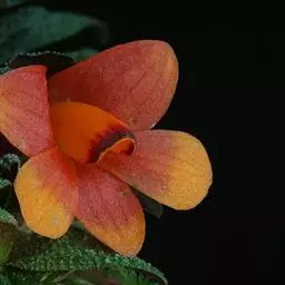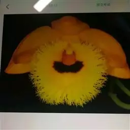 花瓣椭圆形,与中萼片等长,宽8-9毫米,先端稍钝,全缘,具3-5条脉;唇瓣近圆形,直径1.7-2厘米,上面中央金黄色,周边淡紫红色,稍凹的,边缘具短流苏,两面密布短柔毛;蕊柱白色,正面两侧具红色条纹,长约4毫米;药帽白色,近圆锥形,密布细乳突状毛,前端边缘具不整齐的齿。花期4-5月。