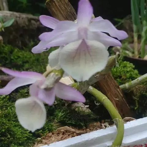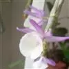花白色或紫红色,每束1-2朵侧生于具叶的老茎上部;花序柄长2-3毫米,基部被1-2枚短的、杯状膜质鞘;花苞片膜质,卵形,长约2毫米,先端钝;花梗和子房淡绿色,长2-3厘米;中萼片卵状长圆形,长1.7-2厘米,宽约7毫米,先端锐尖,具5条脉;侧萼片披针形,长1.7-2厘米,宽6-7毫米,先端急尖,基部歪斜,具5条脉;萼囊近球形,长约5毫米。