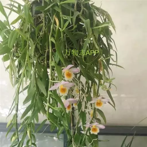 重唇石斛:茎下垂,圆柱形或有时从基部上方逐渐变粗,具少数至多数节。叶薄革质,狭长圆形或长圆状披针形。…