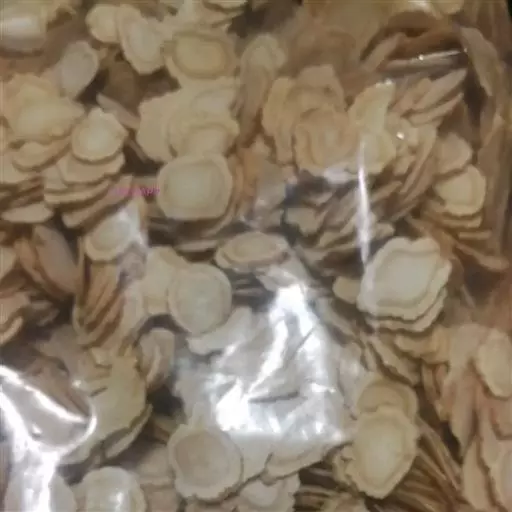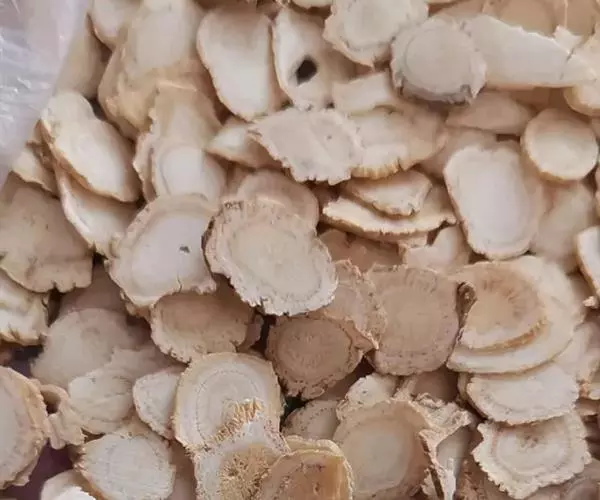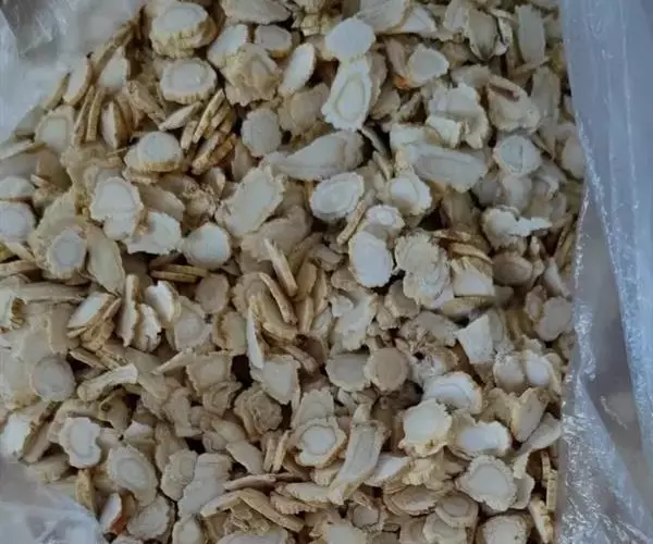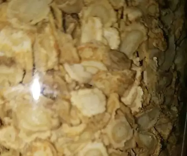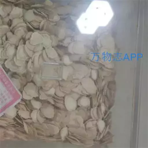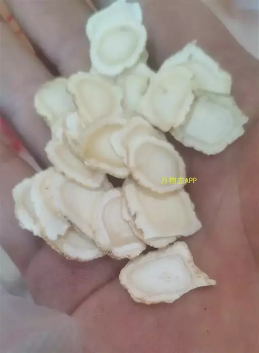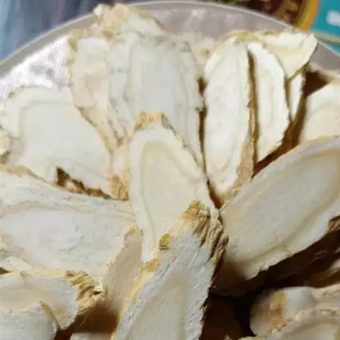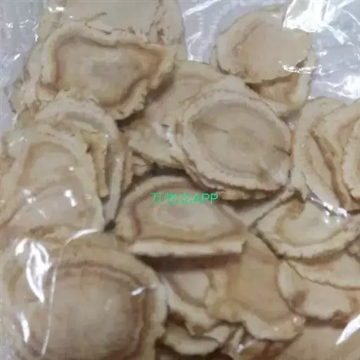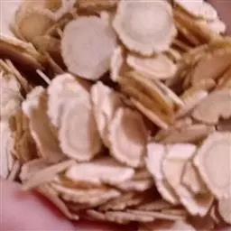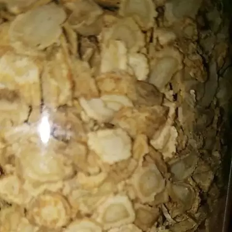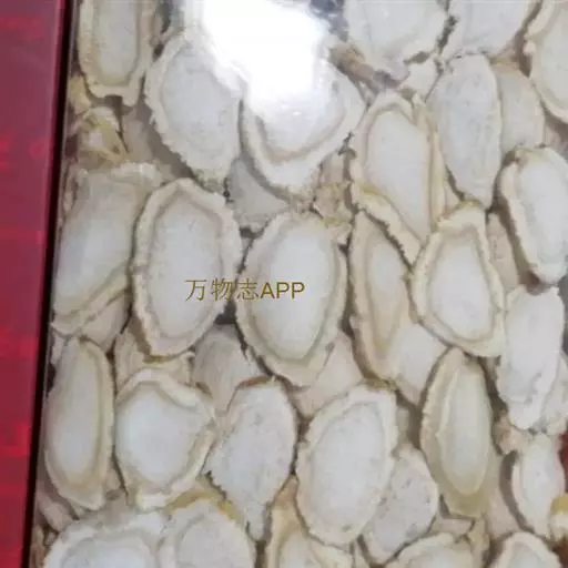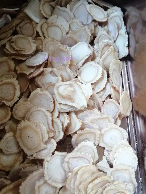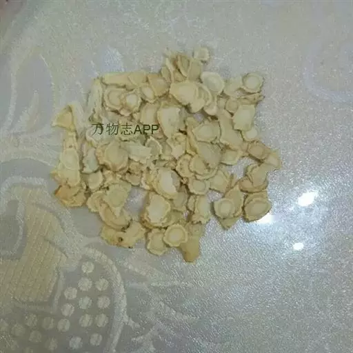 西洋参片 主根呈圆形或纺锤形,芦头残存或已除去,残存者,略偏向一侧;表面呈浅黄色或黄白色,皮纹细腻,具有突起的横长皮孔;质地饱满而结实。折断面略显角质,皮部与木部或中心常有小裂隙。断面呈粉白色,皮部可见一棕色形成层环,环内外散有红棕色小点;苦干味浓,透喉。