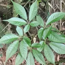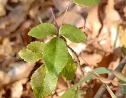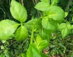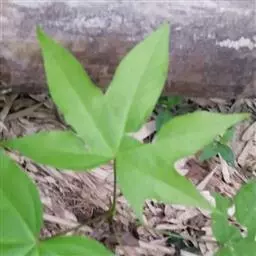 掌状5出复叶,通常3~4枚,轮生于茎端;叶柄长5~7cm;小叶片膜质,广卵形至倒卵形,长4~9cm,宽2.5~5cm,先端突尖,边缘具粗锯齿,基部楔形,最下两小叶最小;小叶柄长约1.5cm,最下二小叶柄较短或近于无柄。