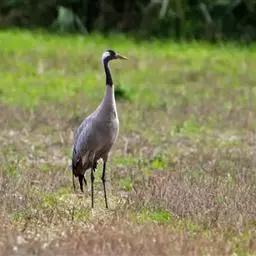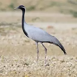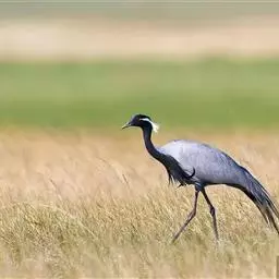 蓑羽鹤大型涉禽,体长68~92厘米,是鹤类中个体最小者。通体蓝灰色,眼先、头侧、喉和前颈黑色,…